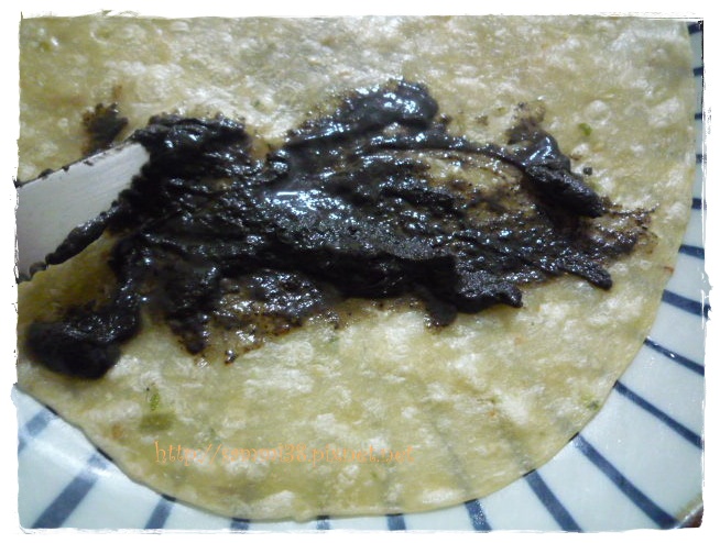 3.擠出適量的義香甜黑芝麻醬於餅皮上