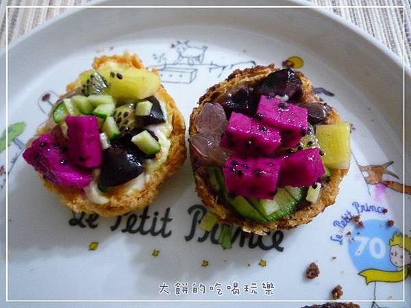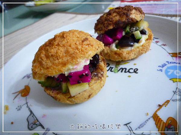 再把切好的水果丁每一種都放一些上泡芙下半部