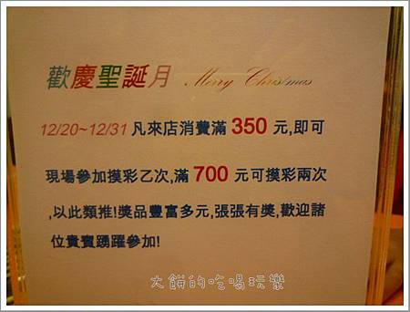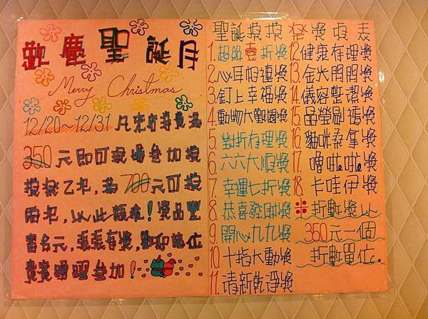 12/20-12/31 來店消費滿350元有1次摸彩機會,700元2次依此類推。