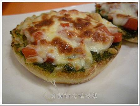 大量老闆自製的羅勒青醬上鋪了蕃茄及素火腿