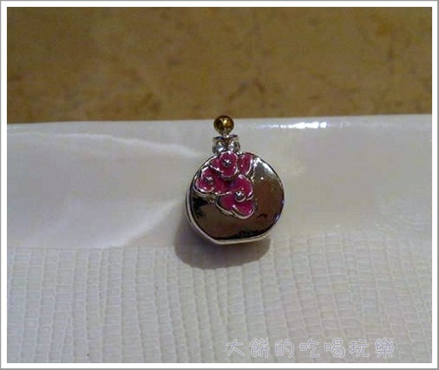 雙面設計的“愛”在巴黎香水 CHARM 是個香水瓶的串珠,一面的桃紅色花朵,另一面是LOVE IN PARIS,小小細簡藏在香水瓶口處,5顆施華洛世奇的鑽石為“愛”在巴黎香水 CHARM增添風采。