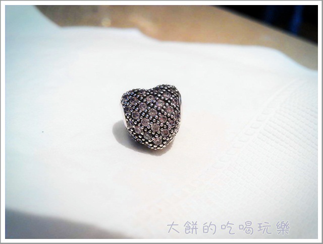 滿鑽密鑲愛心 CHARM上的彩鑽有多種顏色可挑選,大餅的這顆閃閃粉色滿鑽密鑲愛心 CHARM是淡粉色的粉紅鑽,實品在色彩方面粉色較淡,但閃亮度相當高。