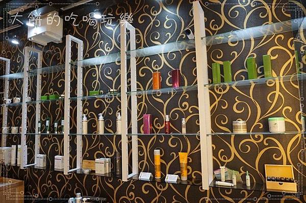 牆上擺滿了美髮用品,倫敦時尚美學沙龍美髮部份,全面採用葳、萊雅品牌之髮品,連孕婦都適用。