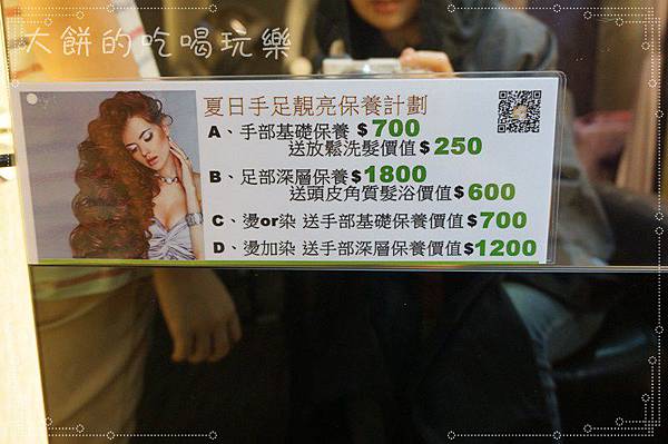 吃著好吃的點心時看到鏡子上的這優惠訊息,等於是買一送一的意思呢~依做的項目不同贈送不同價值的另一種課程,讓妳來到倫敨時尚美學沙龍可以頭手(足)同時變美,很划算的感覺!!還超省時!!!