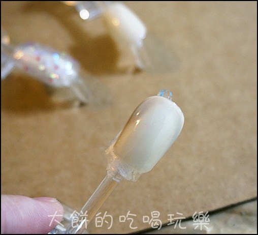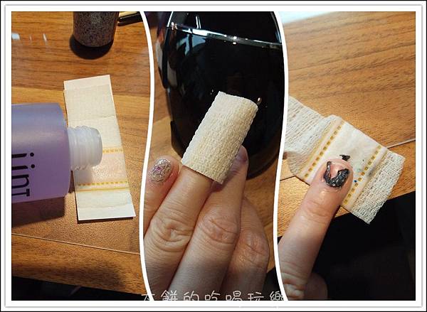 化妝棉沾濕光撩專用卸甲水,輕擦甲面,把甲面上的封層殘膠給清除,這樣6步驟的光撩指彩DIY就完成囉!!