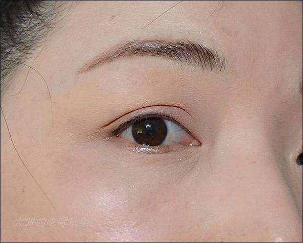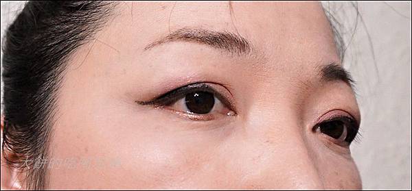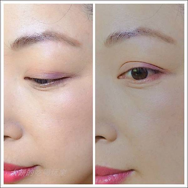 我把粉紅珊瑚放在眼頭1/3(不過半)處,輕刷一層,有淡淡的粉紅色調,疊擦二層,帶有點橘色調的珊瑚粉色,看起來柔合又温柔,利用眼影刷上的餘粉,從眼中段輕刷到眼尾,前深後淺的粉色調眼影,讓眼尾不會看起來泡泡的。再用愛麗絲魔法眼線液筆描繪細細的內眼線,加強眼神~~