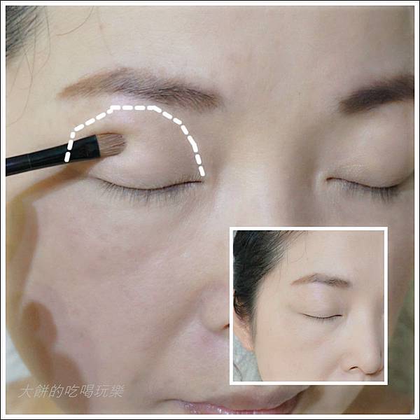 接著再用57粉紅珊瑚,老實說剛看到粉紅珊瑚時,心中有點排斥。哈~因為我眼皮很腫用這種淺色系的眼影會顯得眼睛更腫感。但幾經我試畫後,發現只要放對地方,再加上霧面眼影,沒有大量的亮片,其實並不會讓眼睛看起來更腫。